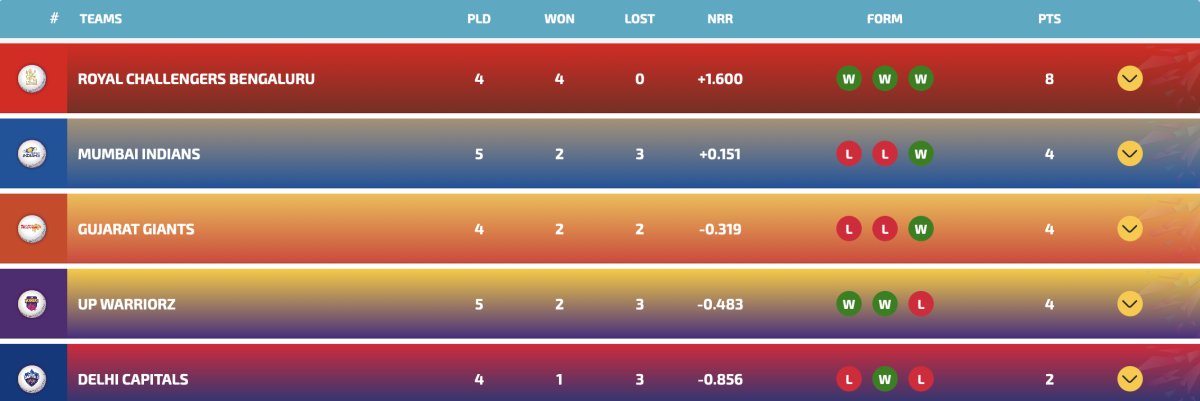 WPL 2026: Points table after match 11, DC vs RCB