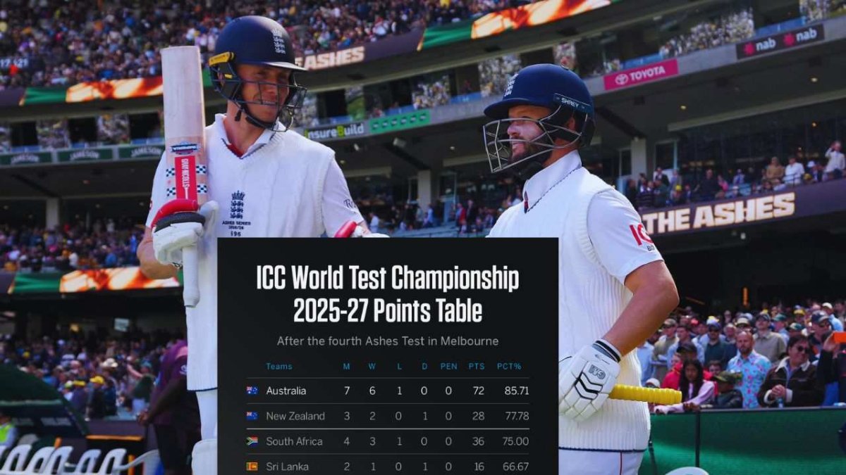 England finally ended their long wait for a Test win in Australia after defeating the hosts in the fourth Ashes 2025-26 Test at the Melbourne Cricket Ground. With this victory, England is in Seventh spot in the latest ICC WTC Points Table with a PCT of 35.19% while Australia is still at the top spot in the ICC World Test Championship 2025-27 Standings with a PCT of 85.71%.