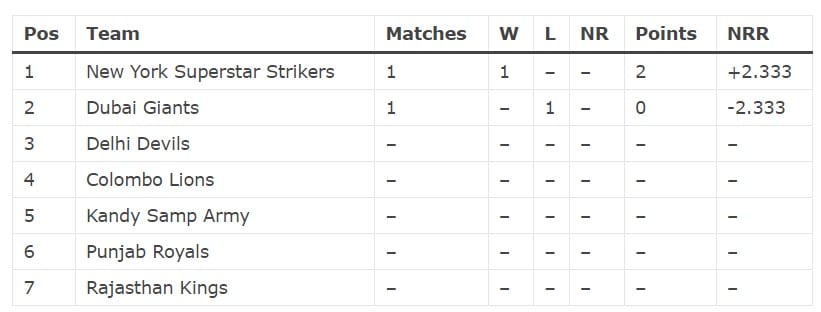 Down below, check the Legends Cricket Trophy 2024 points table and standings after New York Superstar Strikers vs Dubai Giants: