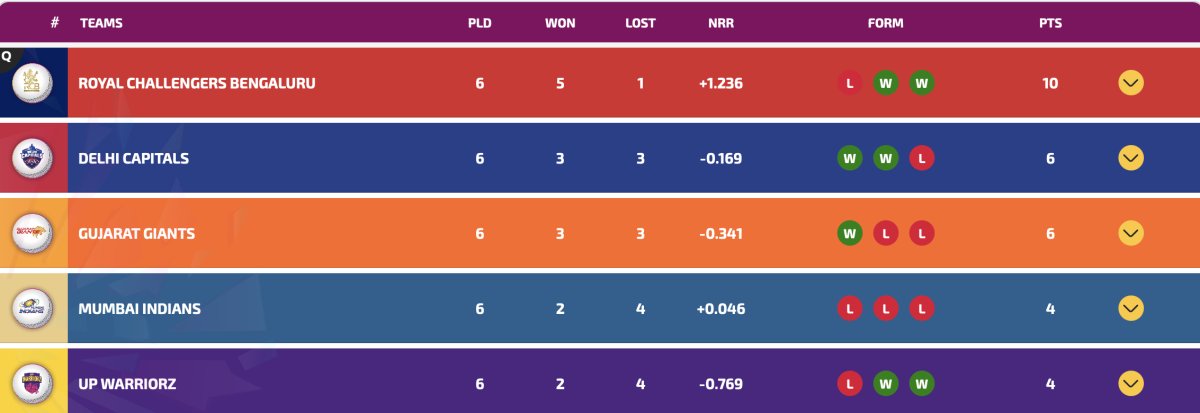 After match 15, RCB vs DC, the Smriti Mandhana-led side is still at the top spot on the points table with Q besided their name. Delhi Capitals moved to second spot in points table. Gujarat Giants are third followed by Mumbai Indians at fourth and UP Warriorz at last in the table.Ā
