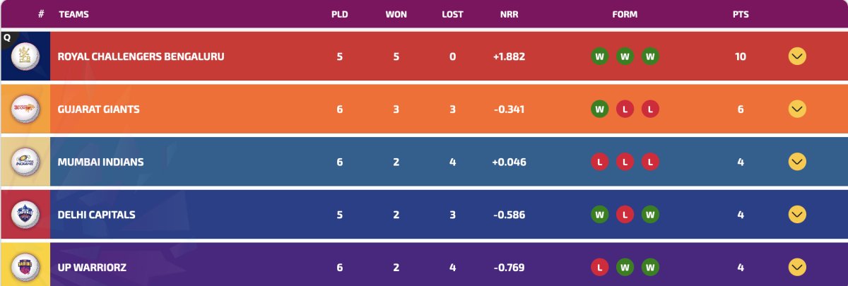After match 13, UPW vs GG, the Smriti Mandhana-led side is still at the top spot on the points table with Q besided their name. Gujarat Giants moved to second spot in points table. Mumbai Indians are third followed by Delhi Capitals and UP Warriorz in the table.
