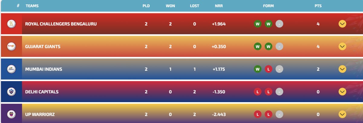 After match 4 of WPL 2026, RCB vs UPW, the Smriti Mandhana-led side has now taken the top spot on the points table. They are followed by Gujarat Giants at the second spot. Mumbai Indians are at third spot, while Delhi Capitals and UP Warriorz are in the last two spots.